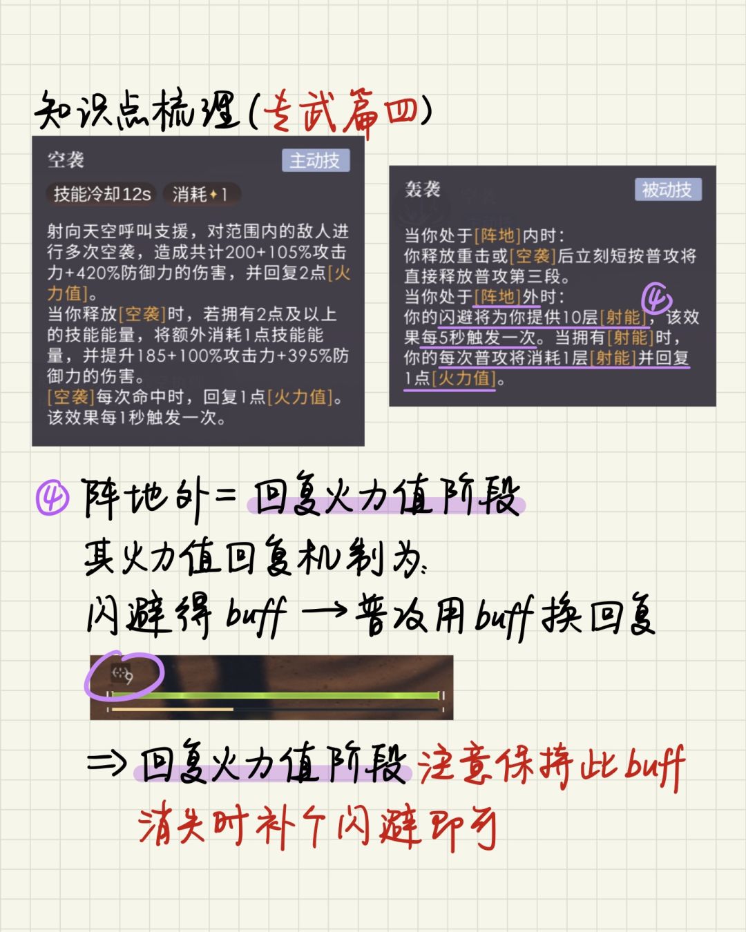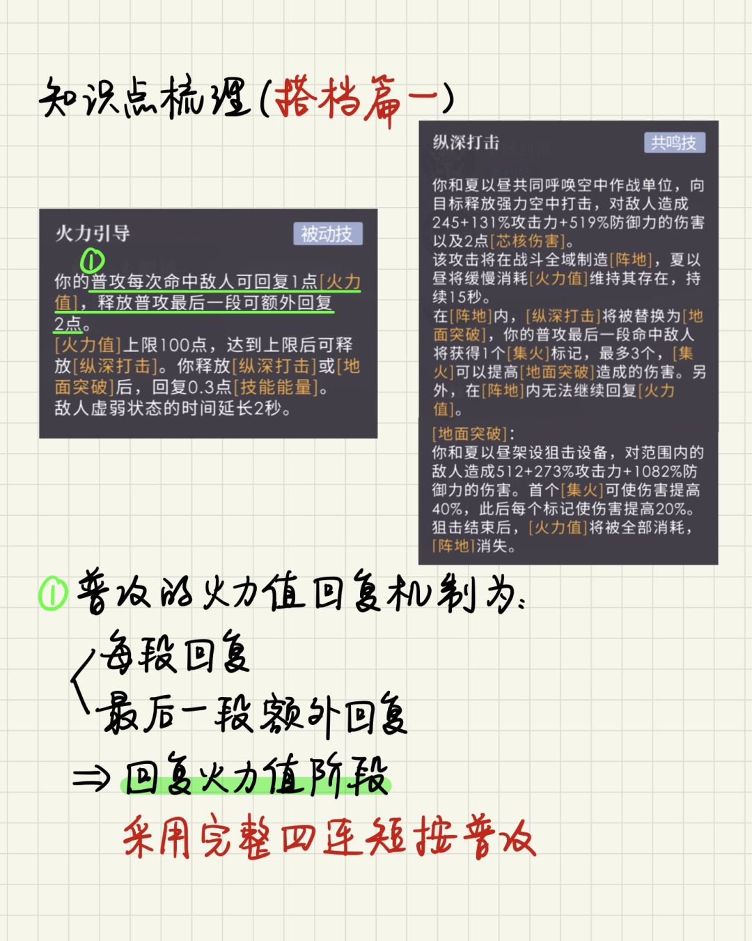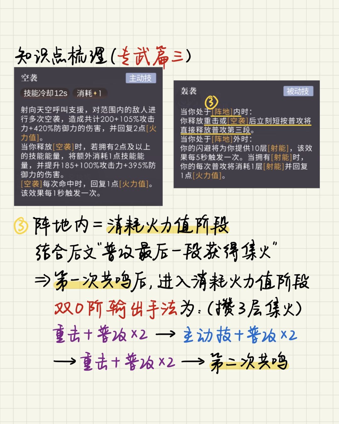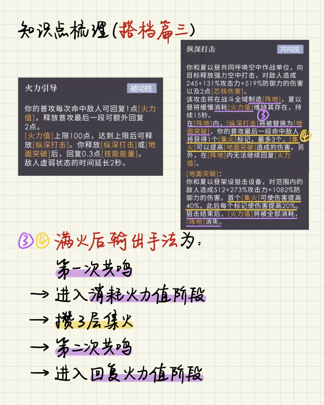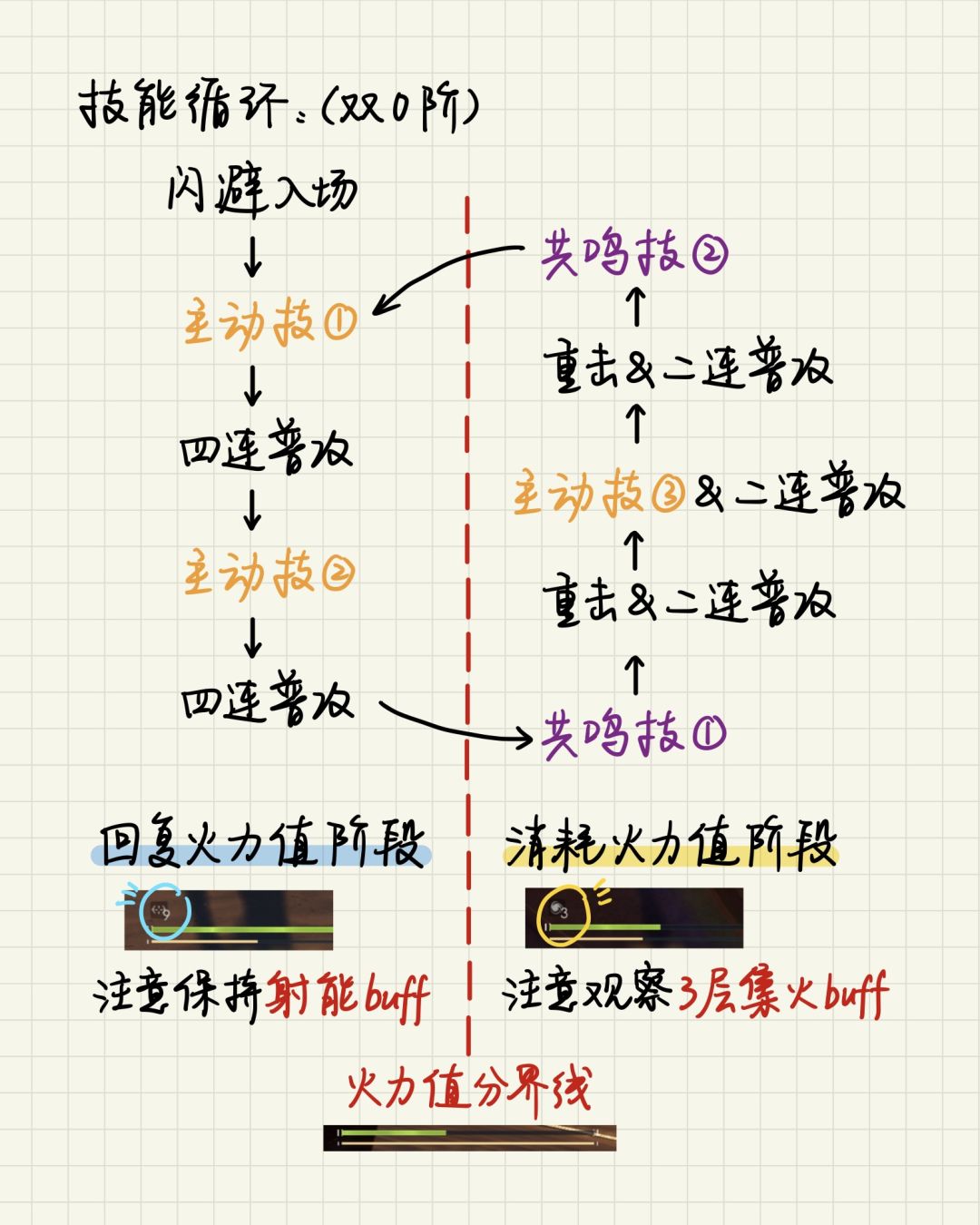 注:P9的技能循环是实战的简化版本。因为双0阶在 火力值消耗阶段 释放重击或主动技可获得增伤buff,建议攒满3层集火后不要马上第2次共鸣,可以再打几次重击,等虚弱期快结束了再第2次共鸣。