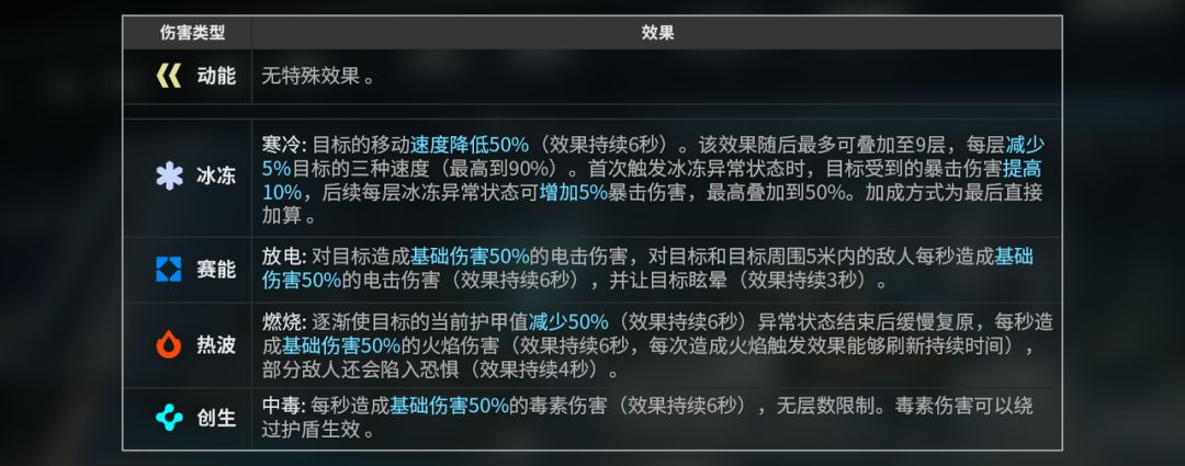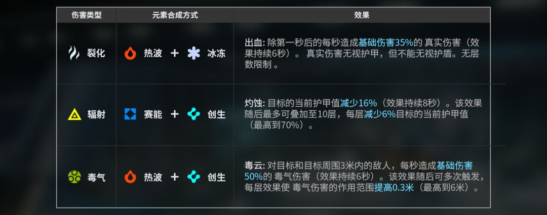 认识元素,掌握元素,是成为优秀战斗员的必经之路。各位战斗员们在第一次接触元素的时候感到困惑也是情有可原,让我们一起来看一下元素的作用吧。首先,元素由动能和四种基本元素类型组成——创生、赛能、冰冻和热波。这些基础元素相互作用,能够组合出6种复合元素:裂化、辐射、毒气、磁暴、以太和病毒。具体组合方式参考以下图表。
