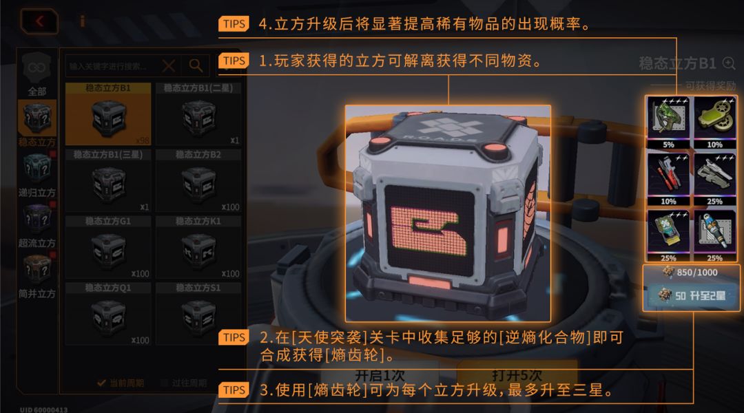 不过……(敲黑板)千万别急着把立方一口气全开完!立方能通过后期获取的【熵齿轮】进行升级,从而增加获取更好物品的概率。