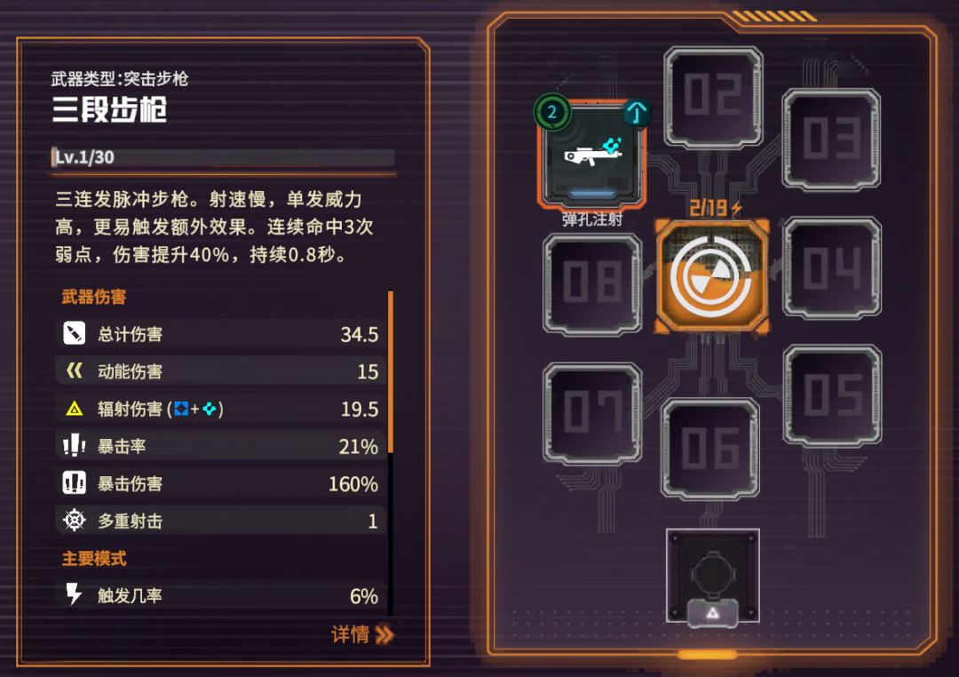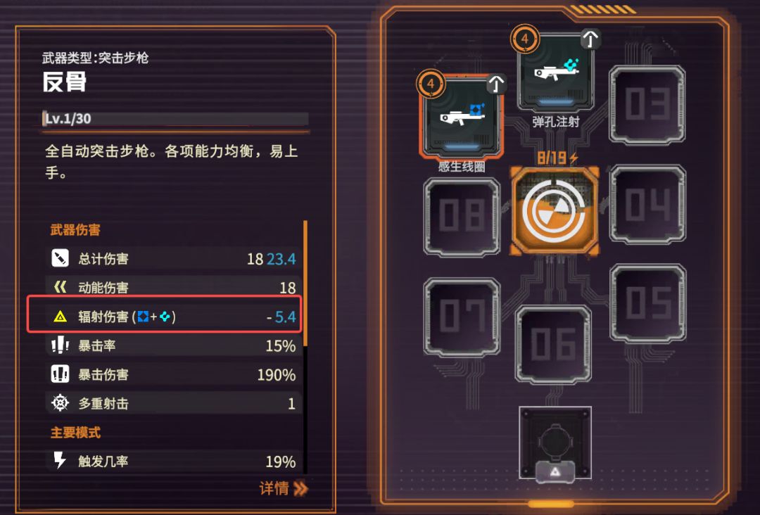 需要注意的是,部分武器带有固有元素属性,无法去除,在计算时会直接与执行卡叠加。以三段步枪为例,它自身带有赛能属性,因此只需要安装创生属性的执行卡,就能使武器带有辐射伤害啦!另外,更高阶的武器还会带有复合元素,就留给战斗员们发挥创造力自行搭配了~