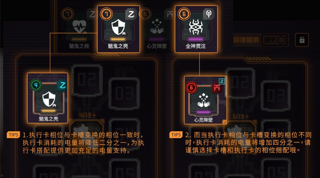 【相位】是执行卡上的固有属性,当装备执行卡时,卡槽的相位与执行卡自身相位的匹配程度会影响到消耗的电量。简单来说,请尽量选择相位匹配的卡槽放入执行卡~