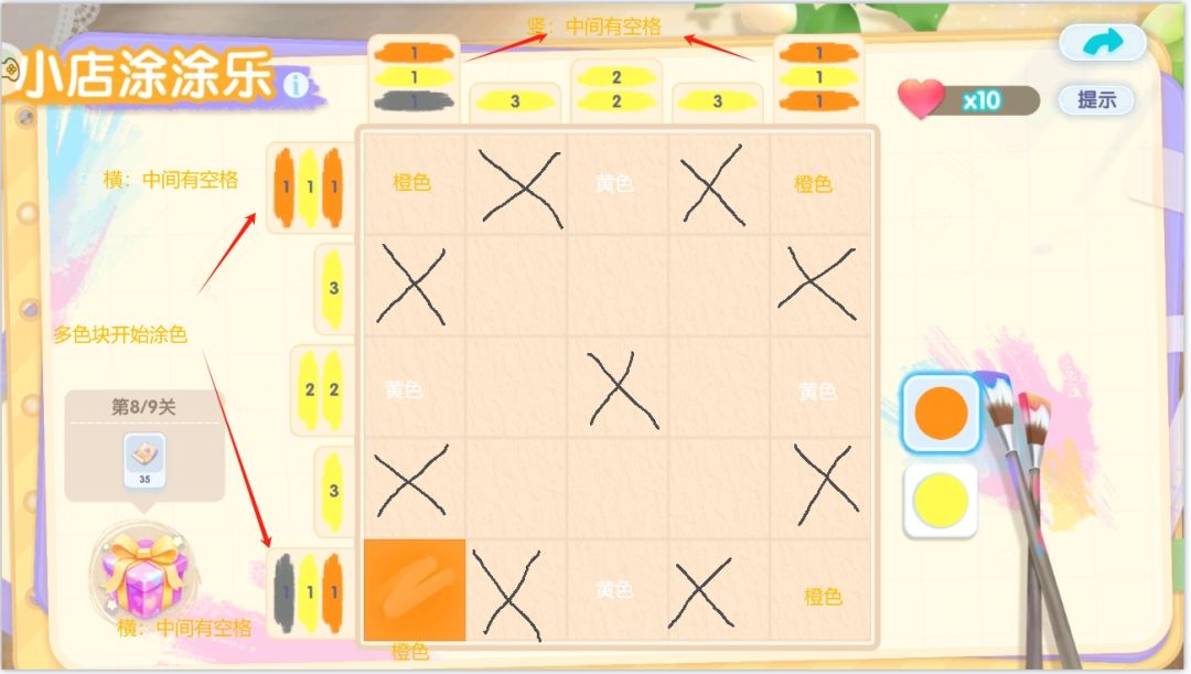 4.多色块关卡,从提示最多的竖排和横排开始涂。