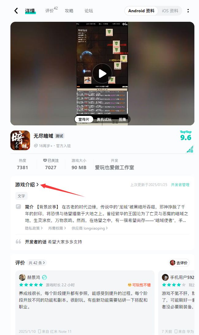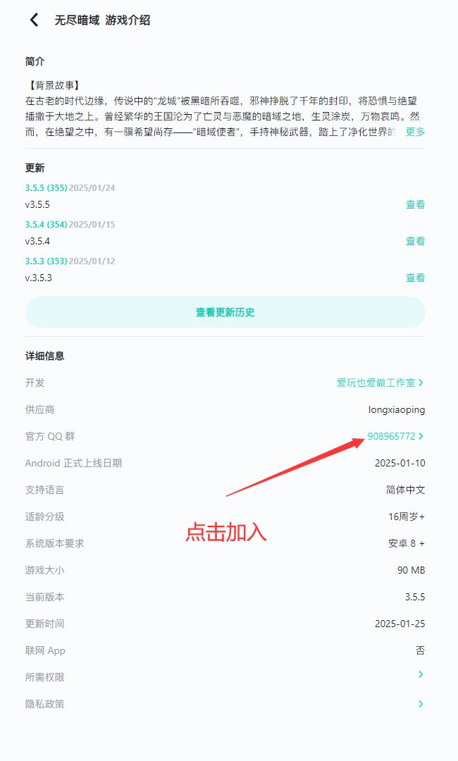 如果无法搜到Q群号,请按下面截图步骤点击加入!先进入Tap游戏主页,后点击游戏介绍,再点击群号即可!