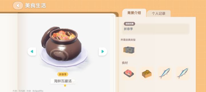 海鲜瓦罐汤:肉:1 土豆:1 沙丁鱼:2(沙丁鱼全天可在海边钓出来)