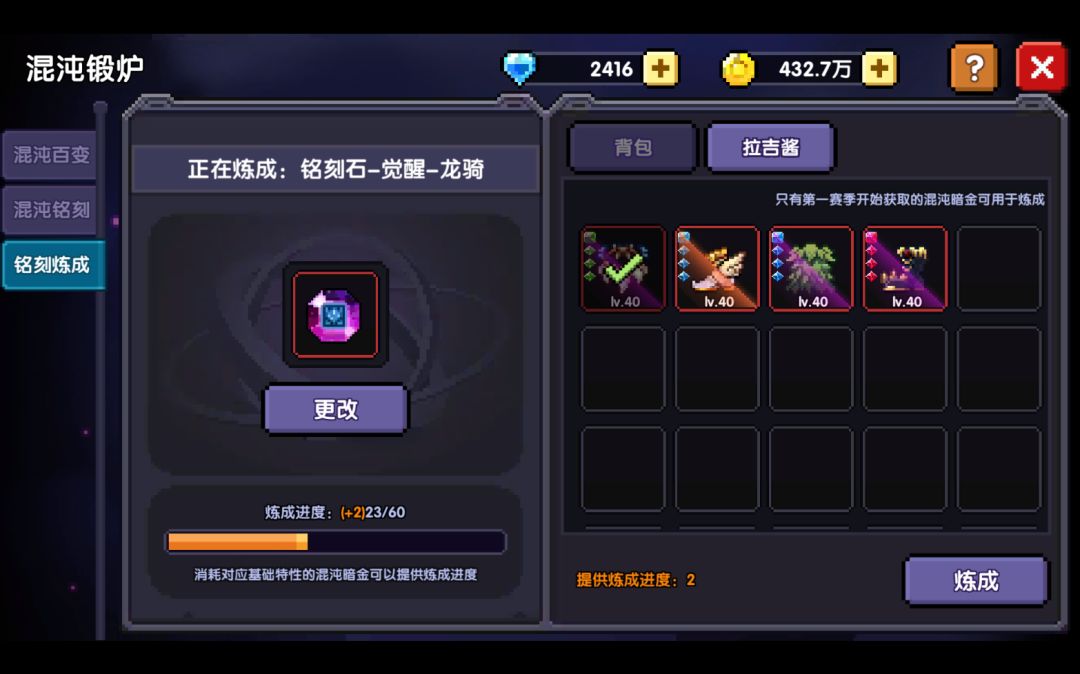 ②熔炼进度与所熔炼的装备有关。例如上图,铭刻龙骑时,所熔炼装备需具有龙骑特性,特性几级即提供几点进度。
