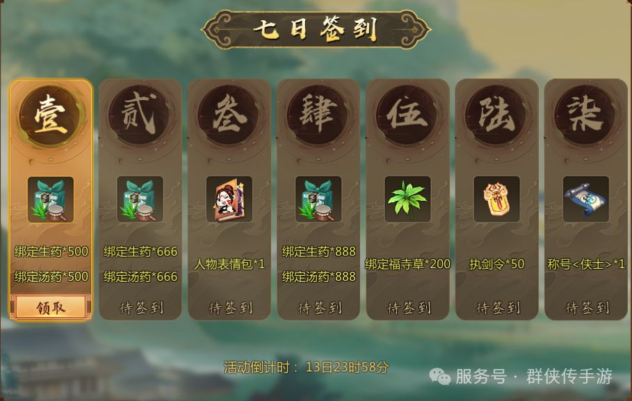 除冲榜活动以外游戏内也存在很多常驻活动助力等待侠士参与。包括新角色七日签到、提升修为奖励、提升年龄奖励等活动。活动内都会存在大量药品助力侠士修炼。免除侠士在修炼时缺药少药的烦恼。