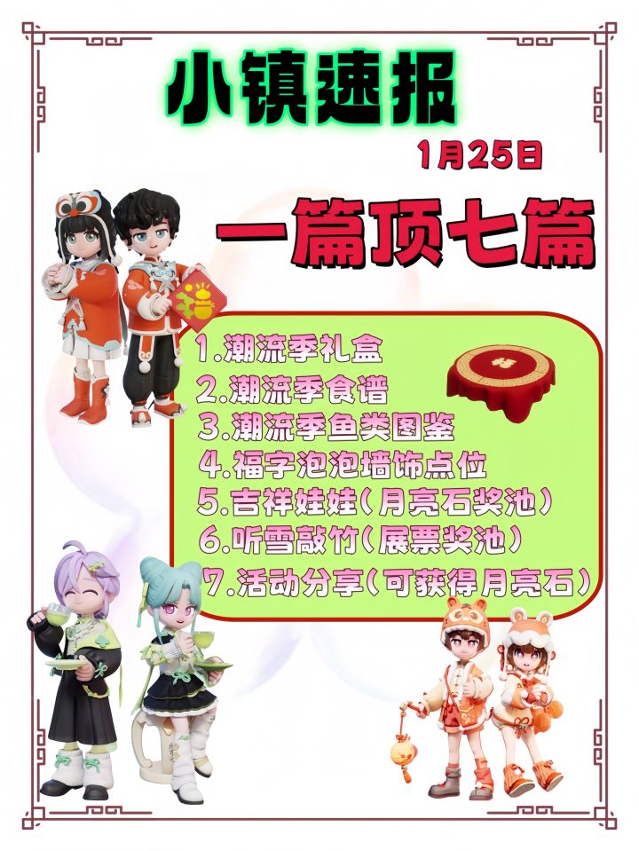新春季礼盒?新春季新食谱(三个隐藏食谱)?新春季第一周鱼类地点时间?福字泡泡点位?新展演和新月亮石奖池?小镇活动分享?可以获得石头攒石头把奖池拿下,如果有帮助可以点赞三连吗?