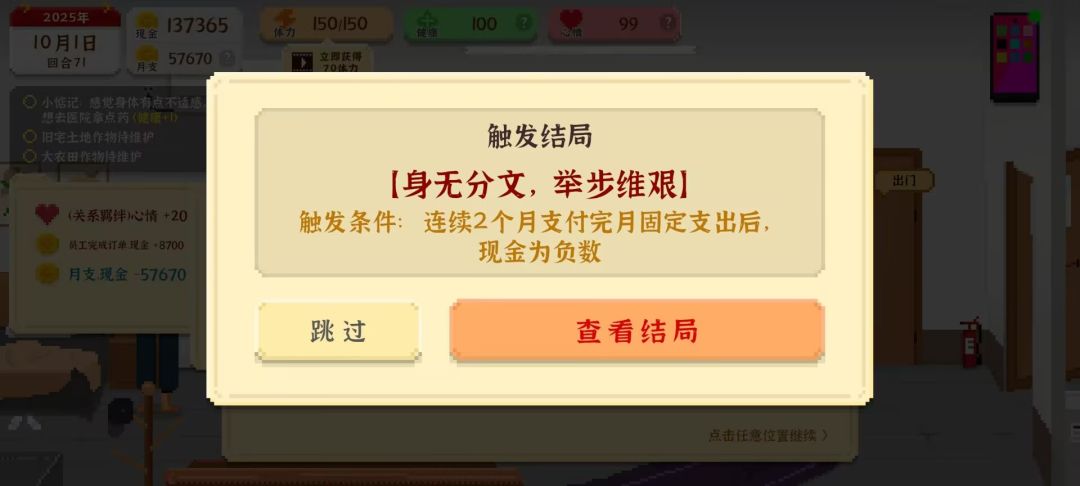 目前1.0.15版本中存在莫名其妙【身无分文】结局的bug,且必定触发,请尽快更新到最新版避免这个bug。