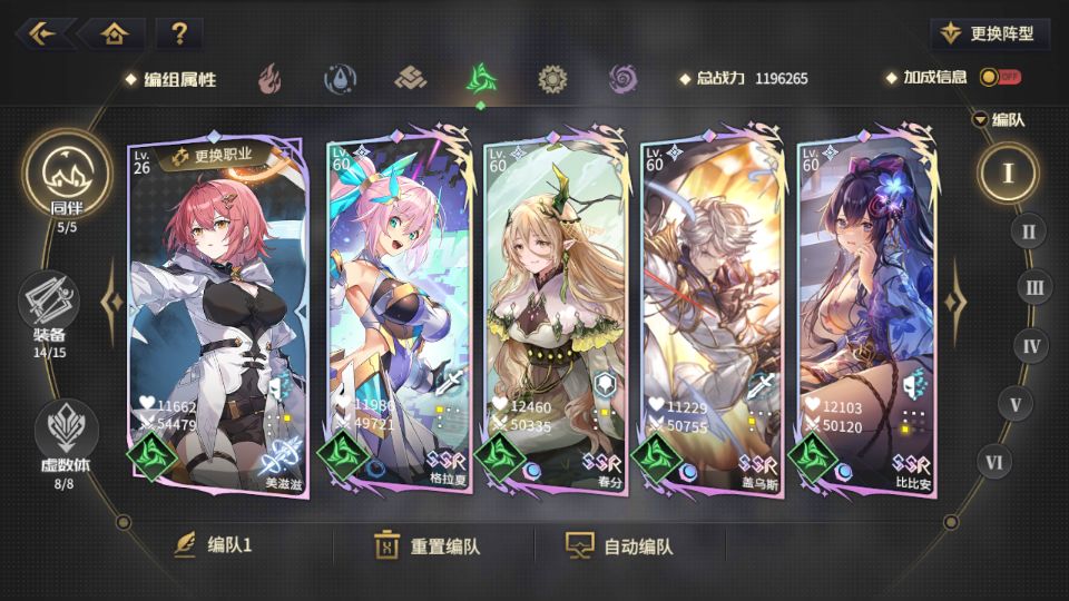 前排角色使用格拉夏、春分、盖乌斯、比比安。