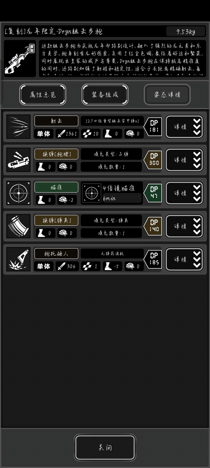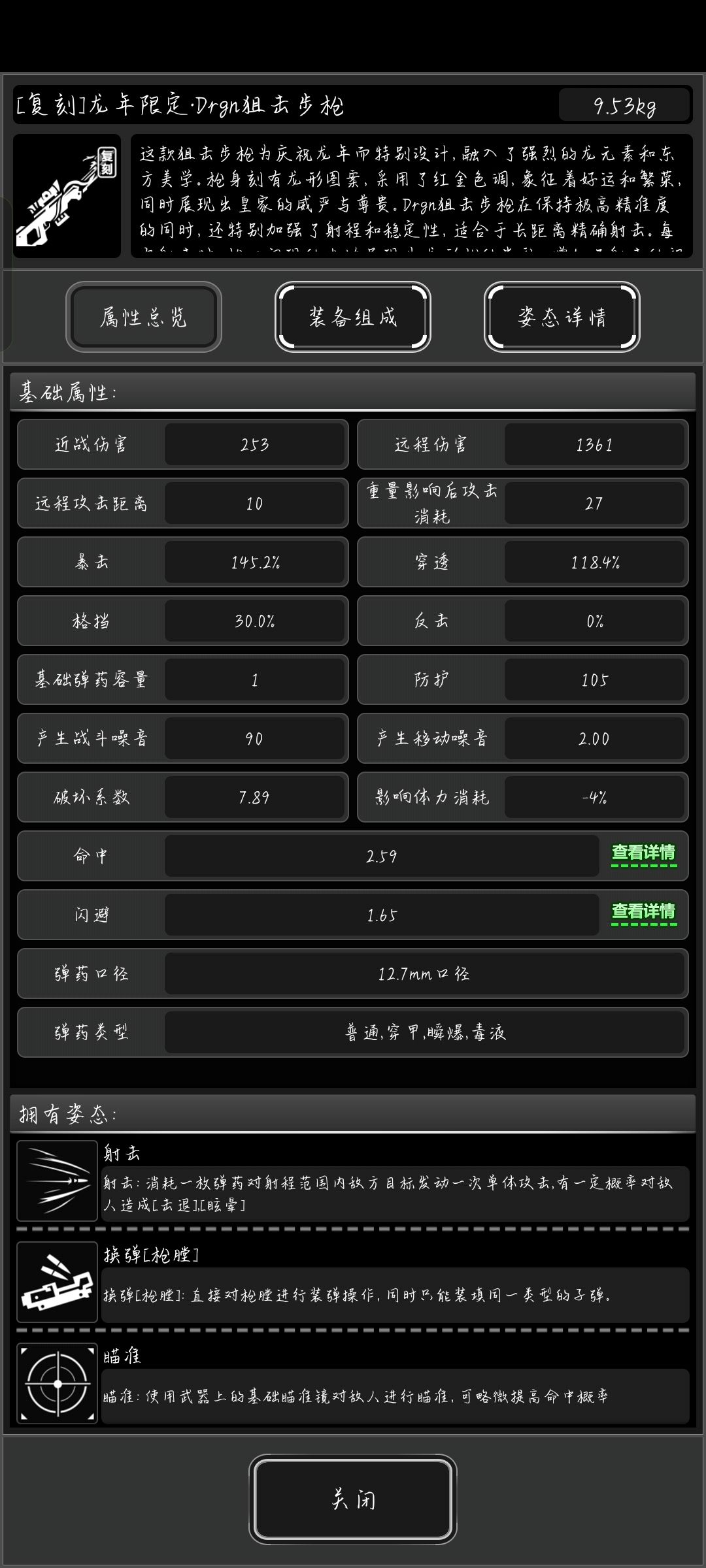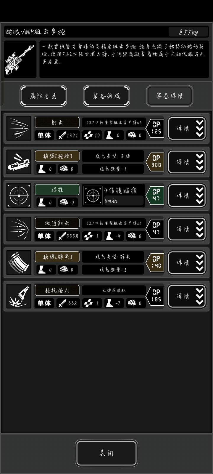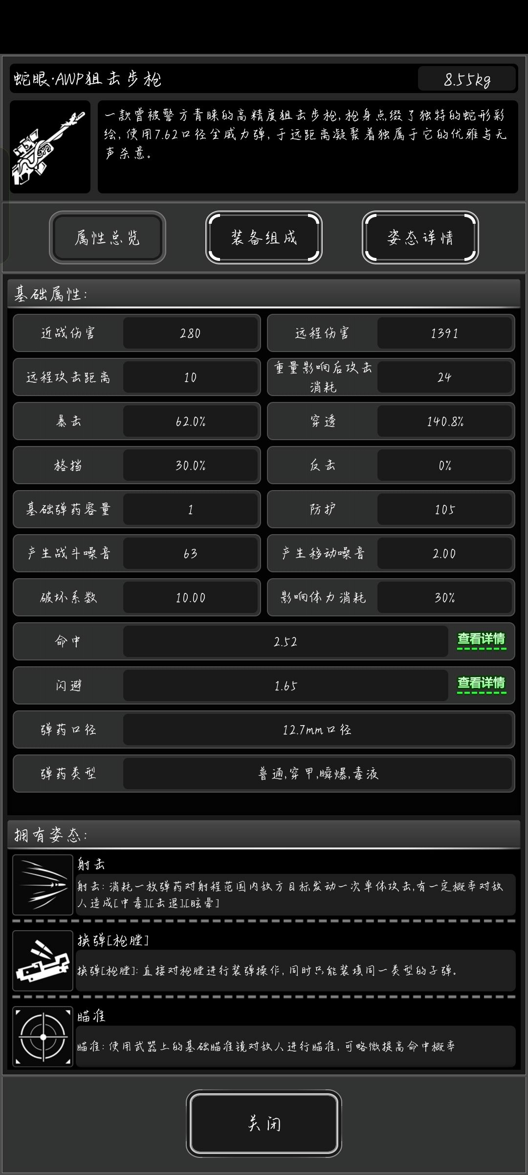 龙年步狙和蛇年awp感觉差不多,不过awp吃散弹抵近射击的加成,一级加5%的远程伤害,如果抵近射击七级的话awp伤害会比龙年步狙伤害更高,只是暴击率就没有那么高了,但是awp目前没有音效,维修成本高于龙步狙,耐久也比龙步狙低10点,要是使用技能的话,awp的耐久会掉的很快,170的耐久一下子就掉了14,不过最多三枪就可以打死一只虫子,也算是成本很低了,综合起来看两枪各有各的优点