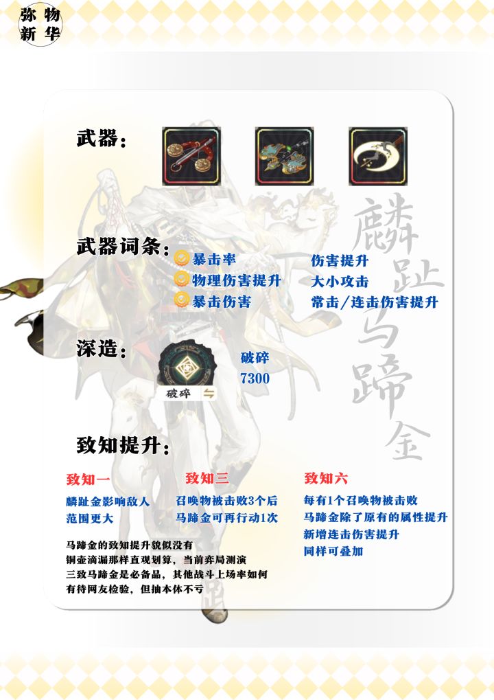 破碎73收益较高,适合长线战局(马蹄金暖机完毕后可自己吃到增益);如果将马蹄金作为辅助安心后排开大的话,点瞄准37,武器可选择熊猫竹弩,因为瞄准也能吃到被动“常击必触发连击”,同时由于深造选择有-瞄准伤害加成,可输出更高,但不如破碎暴力。