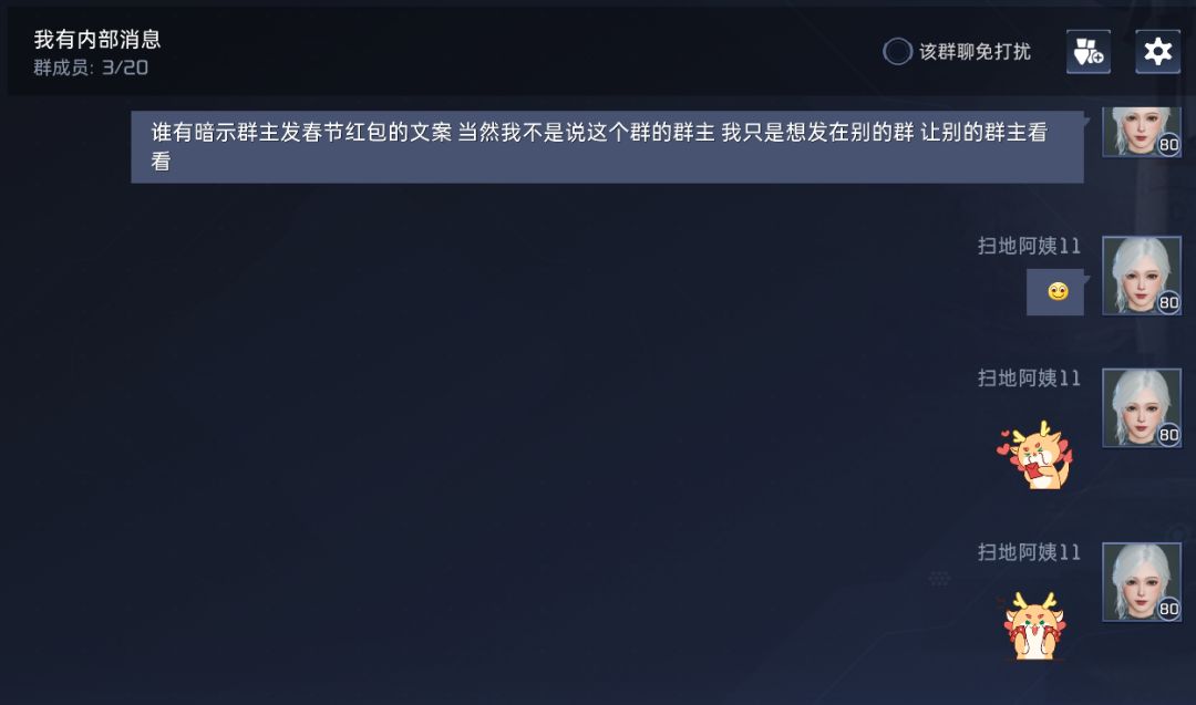 谁有暗示群主发春节红包的文案,当然我不是说这个群的群主,我只是想发在别的群,让别的群主看看。我还是比较心疼本群群主的,如果群主感动了,非要发,那给我发个专属也不是不可以~我真的不是暗示群主哈。我就问问^-^