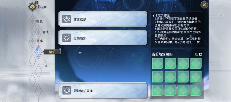 规则说明:可点击熔炉标志投入各种道具增加熔炼值合成护石,合成需要两小时,每次可熔炼5个护石,可同时熔炼12次,只要倒计时结束,即可领取所有护石(并非描述的每2小时可打开一枚,可同时打开所有果实)