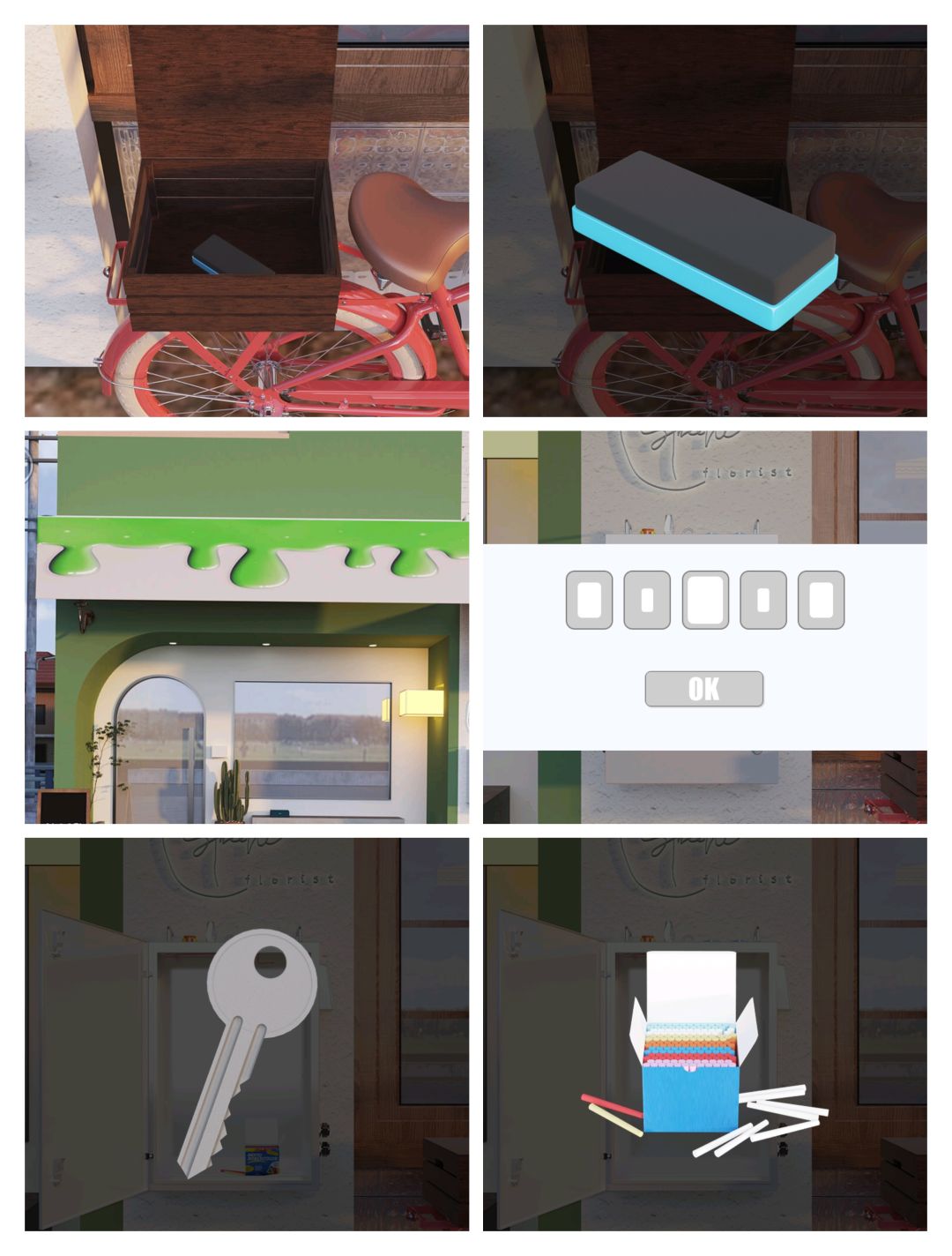 6.根据④蛋糕数量和店外窗户图案 打开厨房左边柜子(按顺序点击)得模具 给厨房小猪 得饼干提示