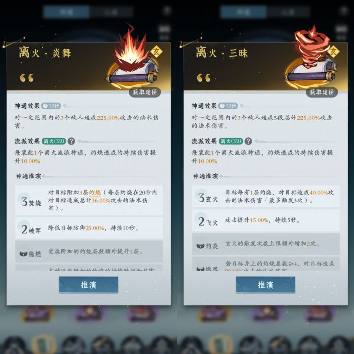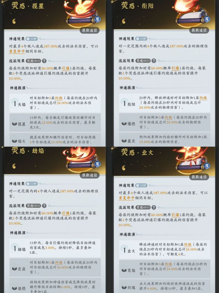 ps:这套更加相对平民化,弥补了上灵界后没有资源养成神通的不足,且三昧和炎舞均能在飞升前到达地阶,伤害数据十分可观,这套6火的体系拥有(灼烧加成,攻击加成与引爆加成),2离火与4荧惑套灼烧层数的同时,有60%的概率引爆,没有被引爆的层数可以吃到火体的层数攻击加成,出伤非常快,并且劫焰与炎舞可以形成双减,减少对手属性,,
