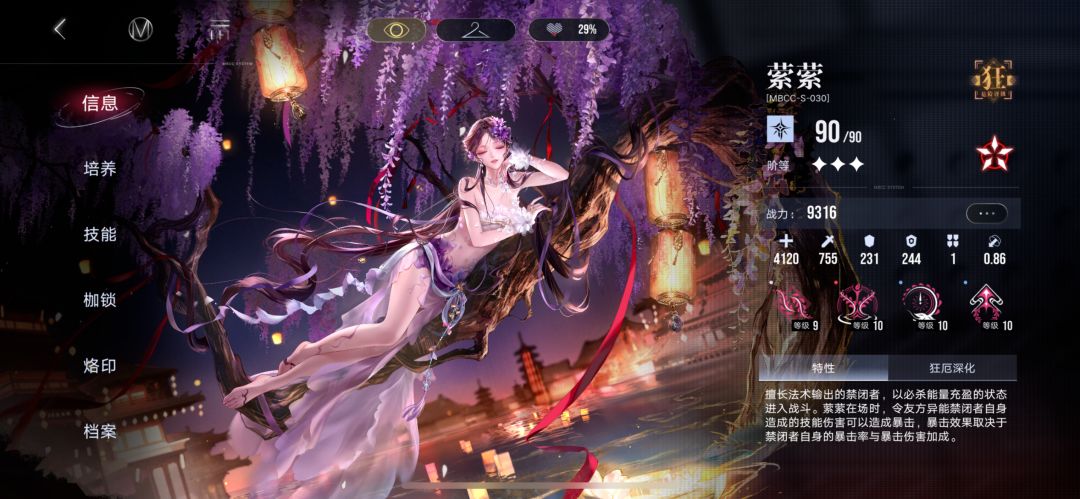 专烙——因为太长了就不全部截图,简单来说就是其他异能禁闭者对带藤花的敌人造成技能伤害时,会触发连锁反应造成萦萦的一定比例的法术伤害,什么意思呢?就是可可的专烙,所以需要其他能打出高频率技伤的异能禁闭者来触发。主动释放时会立刻释放一次垂华并击破核心,只能用一次,没什么好说的,需要尽早3专