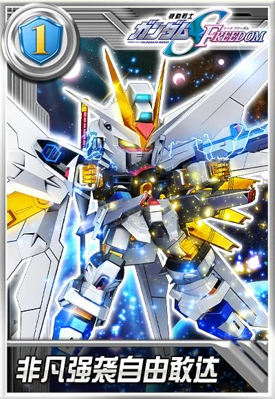 当我方上阵5台主角型或5台格斗型或5台SEED/SEED-DESTINY/SEED-ASTRAY/SEED-DESTINY-ASTRAY-R/SEED MSV/SEED ASTRAY 天空皇女/SEED FREEDOM系列机体时,开场3秒后,非凡强袭自由敢达造成伤害时,使敌方全体无法回复能量/无法回复耐久(两者均无法驱散),持续5.1秒,并清除敌方全体护盾,同时为我方全体添加护盾,护盾值为非凡强袭自由敢达耐久上限的23.0%,持续5秒,冷却8秒。