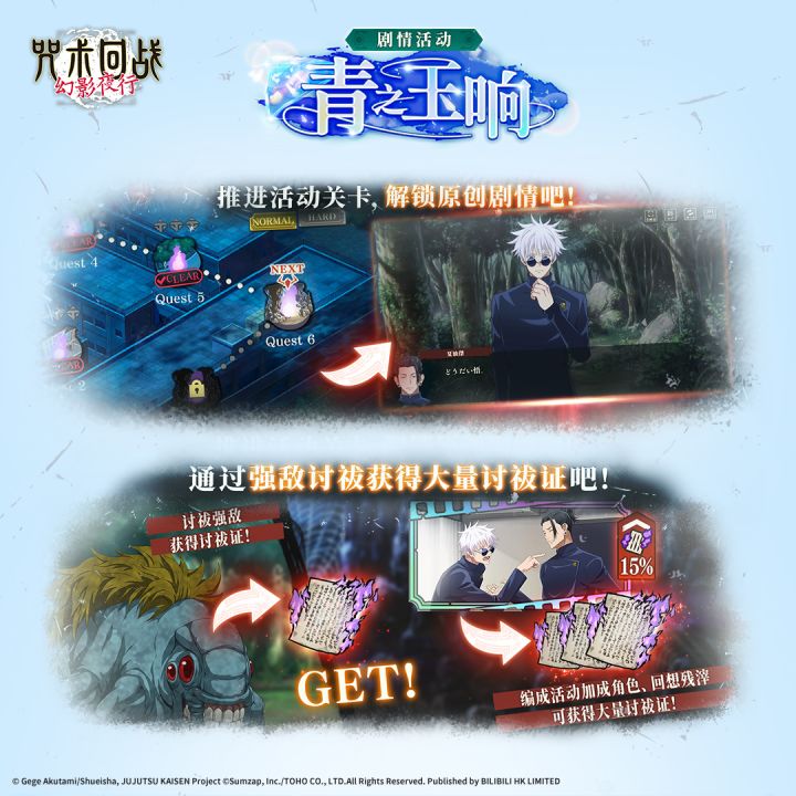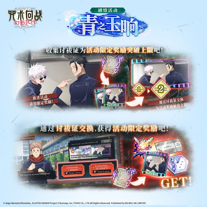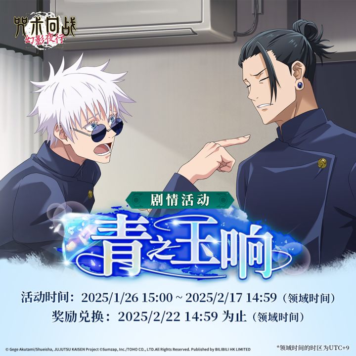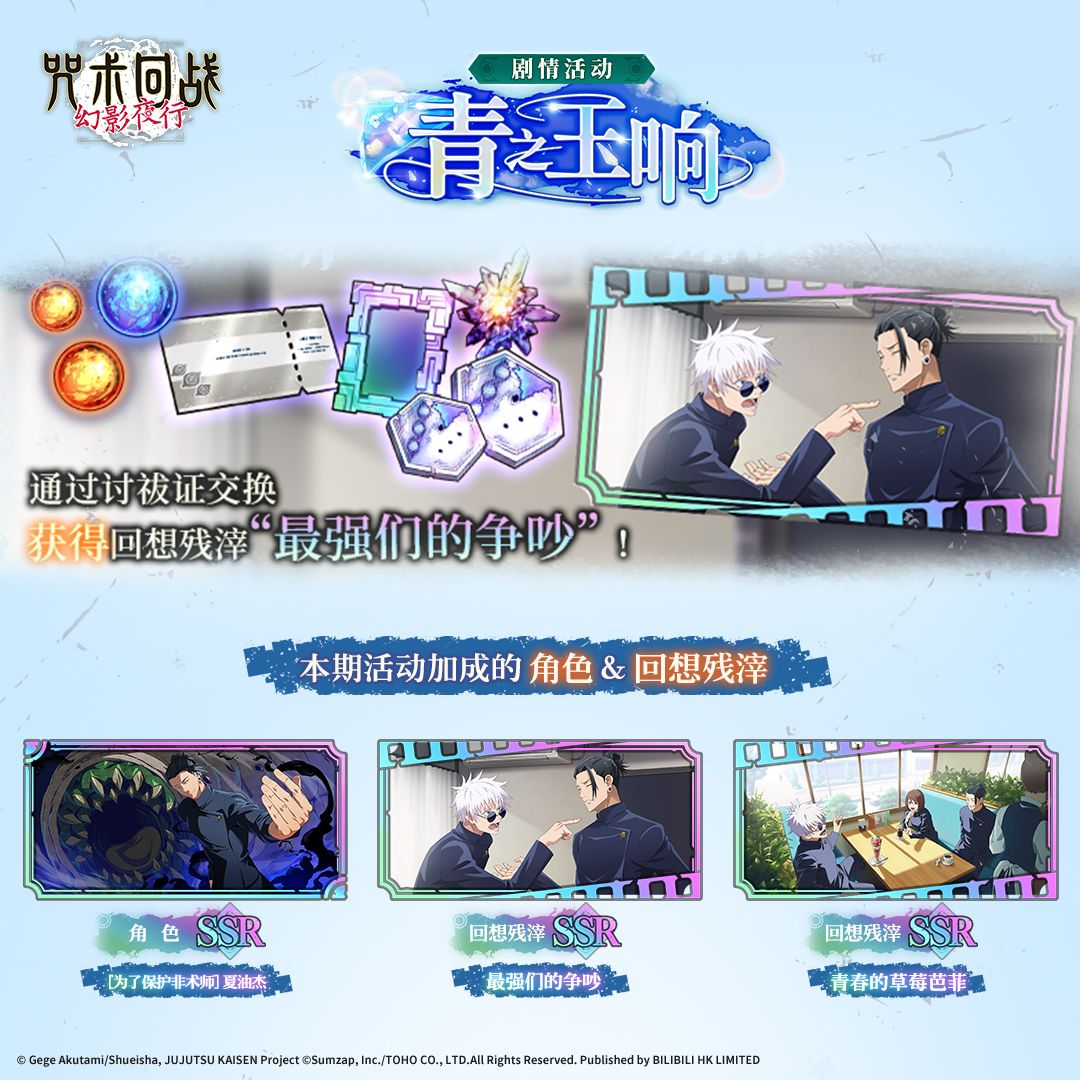 【青之玉响】剧情活动即将开启!这是一个可以观看五条悟和夏油杰在咒术高专期间发生的故事,并获得各种游戏内奖励的活动。推进任务进度,即可获得最多15张【咒术回战 怀玉・玉折 -第2期- 扭蛋券】,以及活动限定SSR回想残滓[最强们的争吵]。