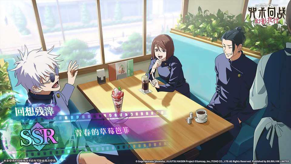 SSR回想残滓[青春的草莓芭菲]以上角色和回想残滓,将在【咒术回战 怀玉・玉折 -第2期- 】扭蛋中,获得出现概率提升