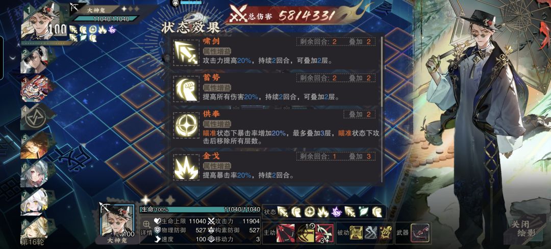 马蹄金三吱吱,武器吃亏,用的金桂弩相当于白板武器,毕业词条。每回合都三动,大招-常击-常击跟连击