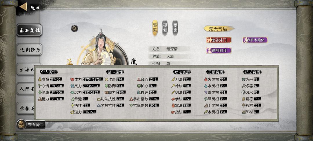上图可以看到,悟性150了还是有两条回溯不了,也没必要追求太高悟性来丢失开局选先天其他属性