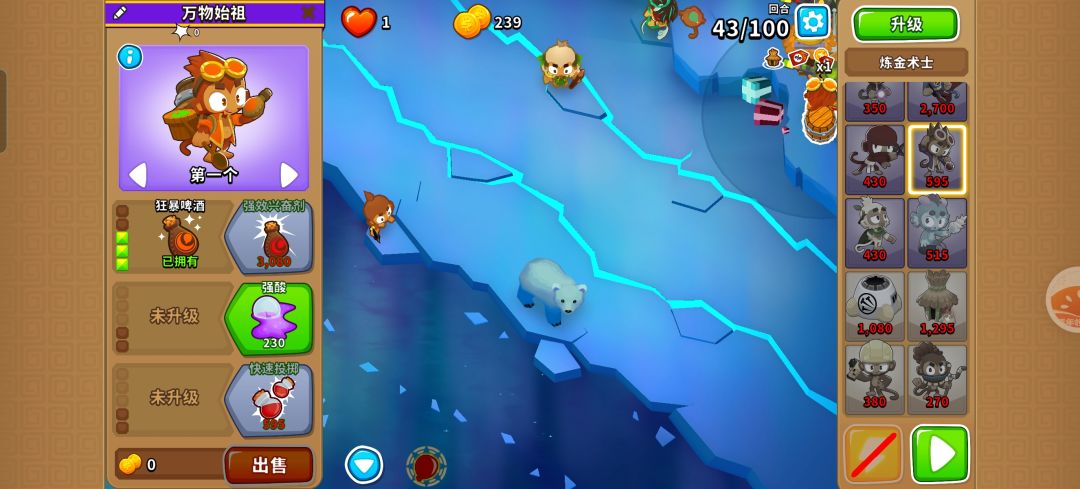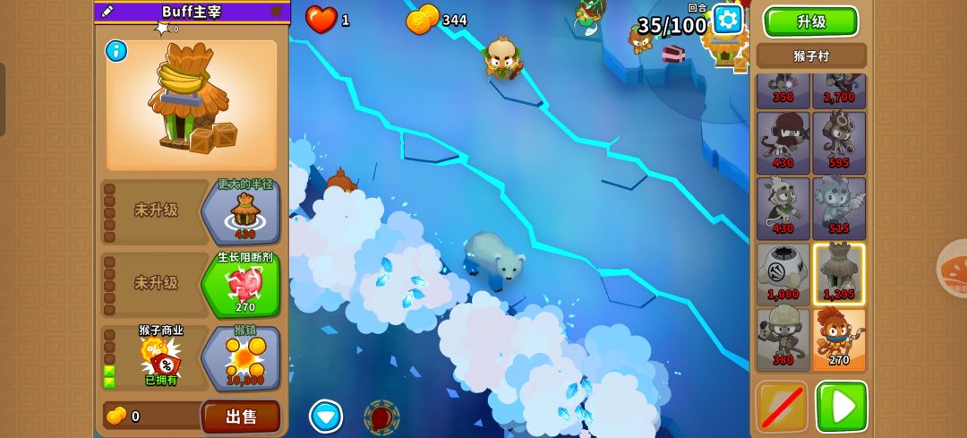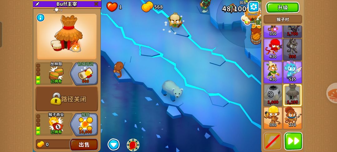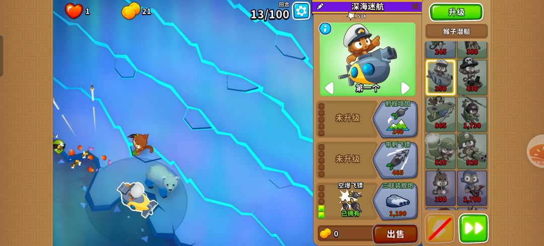1,毛毛和潜艇开局,具体摆放如下图,潜艇尽量覆盖前面竖的道路。有钱后立刻把毛毛升到001