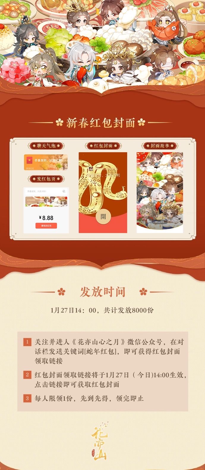 灵蛇献瑞千家福,彩凤翔云万户兴。《花亦山心之月》新春微信红包封面今日发放,快来领取你的蛇年新春红包封面吧!