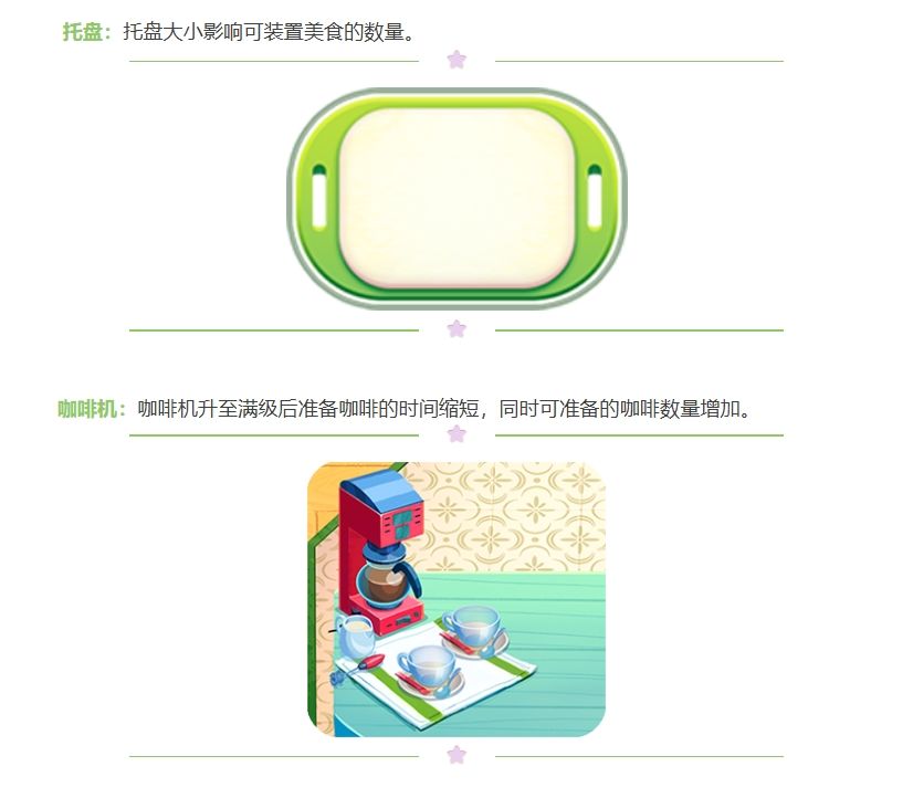 升级装饰将影响食物的价格、制作速度、顾客的耐心等等,别忘了点点升级喔。
