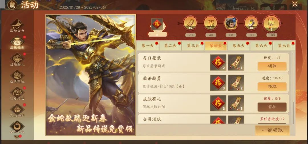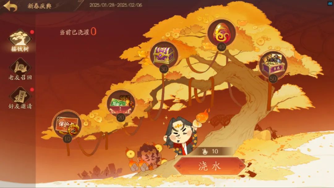 春节期间,完成每日任务可获得一定数量的水滴,使用水滴给摇钱树浇水,可获得不同档位福利,最终档位可获得【传说皮肤自选宝箱】!