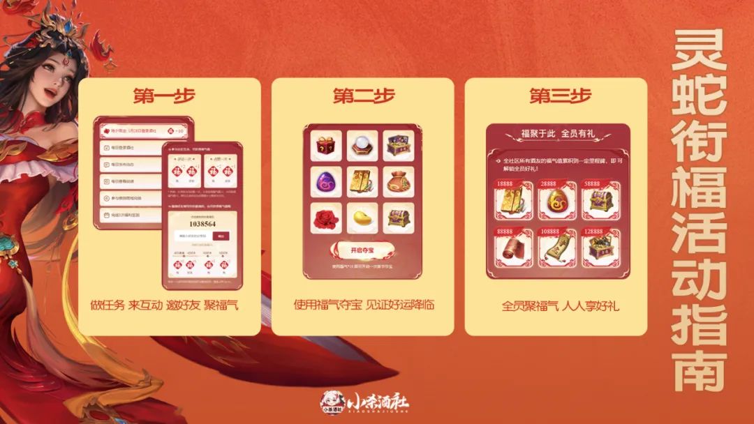 1月28日-2月4日,小杀酒社开启新春聚福气活动。累计福气参与夺宝,武将、转生丹等大奖等你领!全员聚福气,更有传说皮肤、锦绣奖励人人可享!