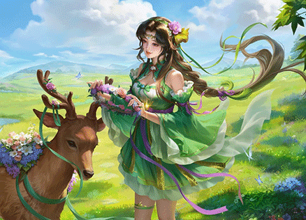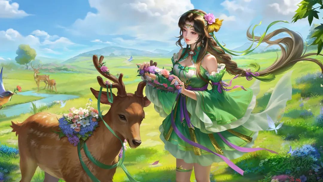 绿茵茵的草地上,孙茹正细心地为鹿灵编织花环,雀儿也衔来花枝,乖巧地陪伴孙茹,置身温暖的春风中。