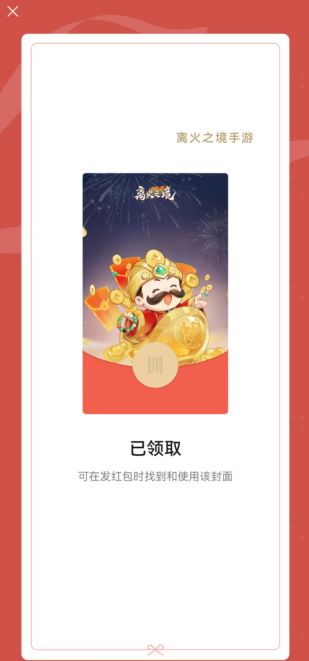 离火贺新春,蛇年添“红”运!继第一次红包封面发放后,很多寻火者都说没有领到,今天,离火之境再次为各位寻火者准备了离火限定微信红包封面,领取方式见下文,数量有限,寻火者们赶快领取,先到先得哦!