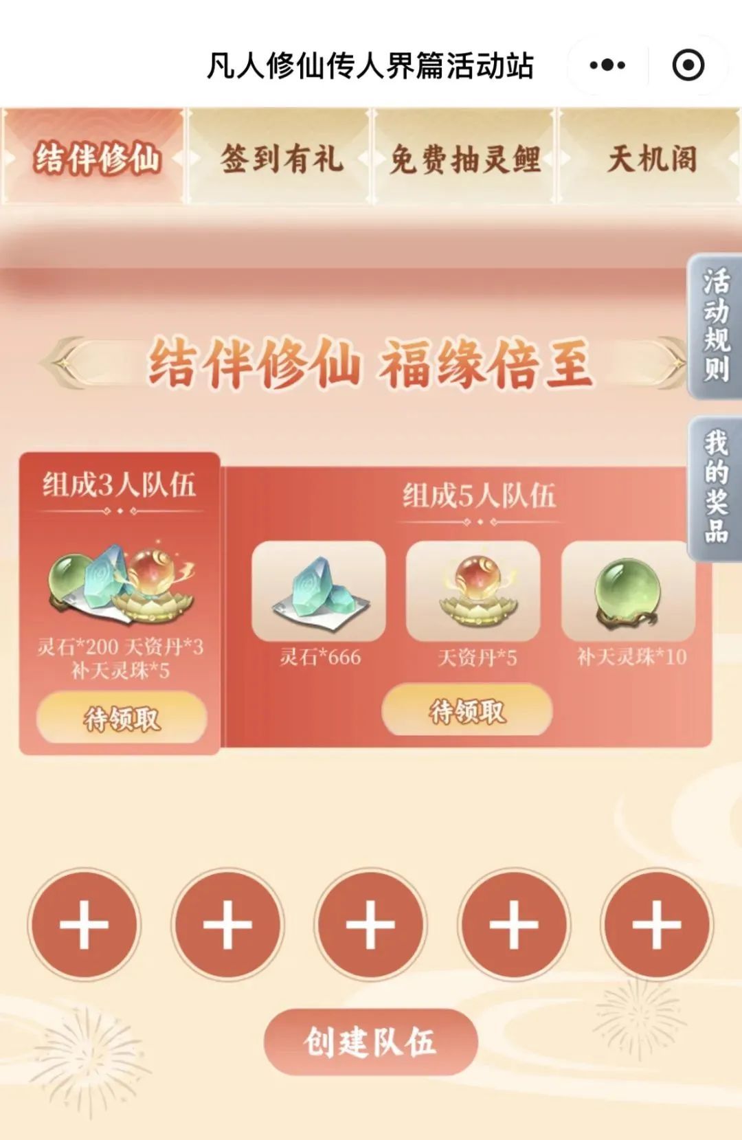 结伴而行:邀请您的修仙小伙伴一起组队,即可获得灵石丹药奖励!