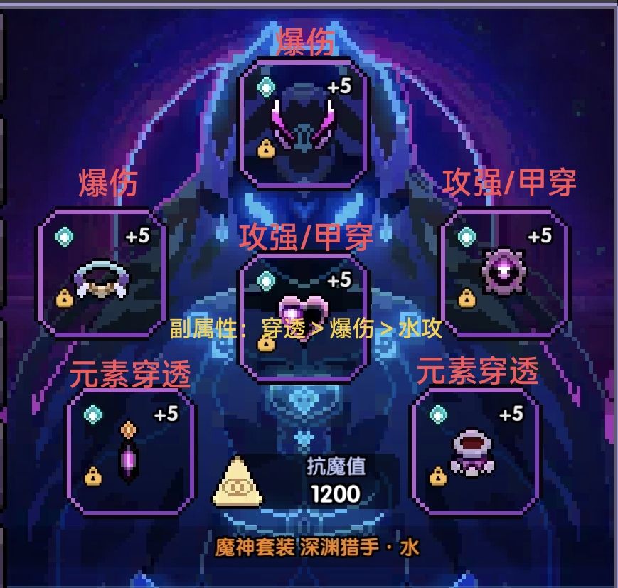 副属性:9元穿,7水攻2爆伤/6水攻3爆伤,水攻可以适当洗多一点,不过还是哪个更接近最高值用哪个