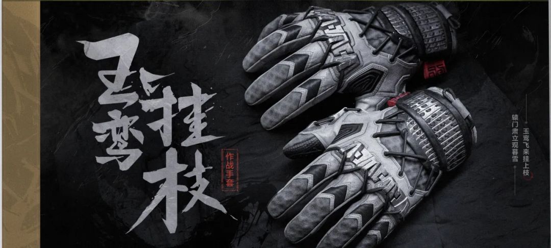 肃穆黑色系皮革材质构成的角弓得控 · 手套,有绿色系绳索装饰点缀,而玉鸾挂枝 · 手套以银灰做主色调,纯净的颜色隐匿于风雪世界中,尽管手套采用了黑白的低调色彩搭配,却也无法隐藏其内在的锐利气息。