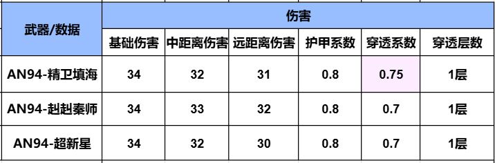 再来对比下同系列的两款武器的伤害,我们可以看到三款武器的基础伤害一致,中距离伤害同AN94-超新星一致,远距离伤害在两款武器中间,但穿透系数高于其他两款武器,可见这把AN94-精卫填海在伤害上还是有一些优势的。
