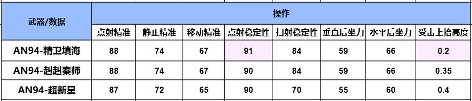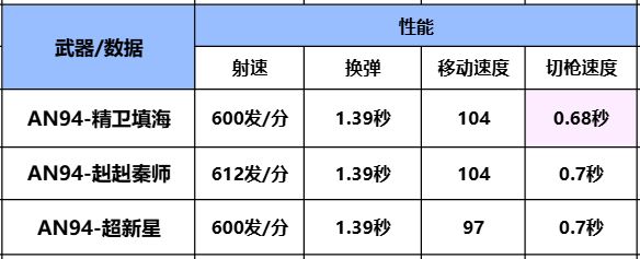 三款武器在性能对比上可以看出,AN94-精卫填海在切枪速度上要略高一些,射速和AN94-超新星一致,移动速度和AN94-赳赳秦师一致,这样对比下AN94-精卫填海还是不错的。