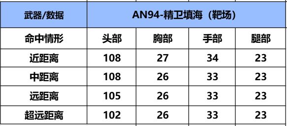 我们来到靶场测试下AN94-精卫填海的伤害,从表格上可以看出AN94-精卫填海的伤害并没有因距离衰减很多,基本上打中头部有一些距离衰减,打中身体部位的伤害都相差不多。