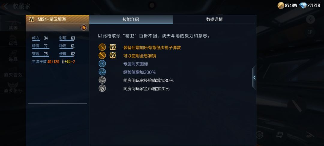 AN94-精卫填海以此枪歌颂“精卫”百折不回,战天斗地的毅力和意志,我们在游戏里也应该有这样的毅力和意志,只有这样才会拿下每个对局的胜利,这把武器有着可以使用全息准镜的技能,在游戏里开镜能够更加精准地瞄准敌人。