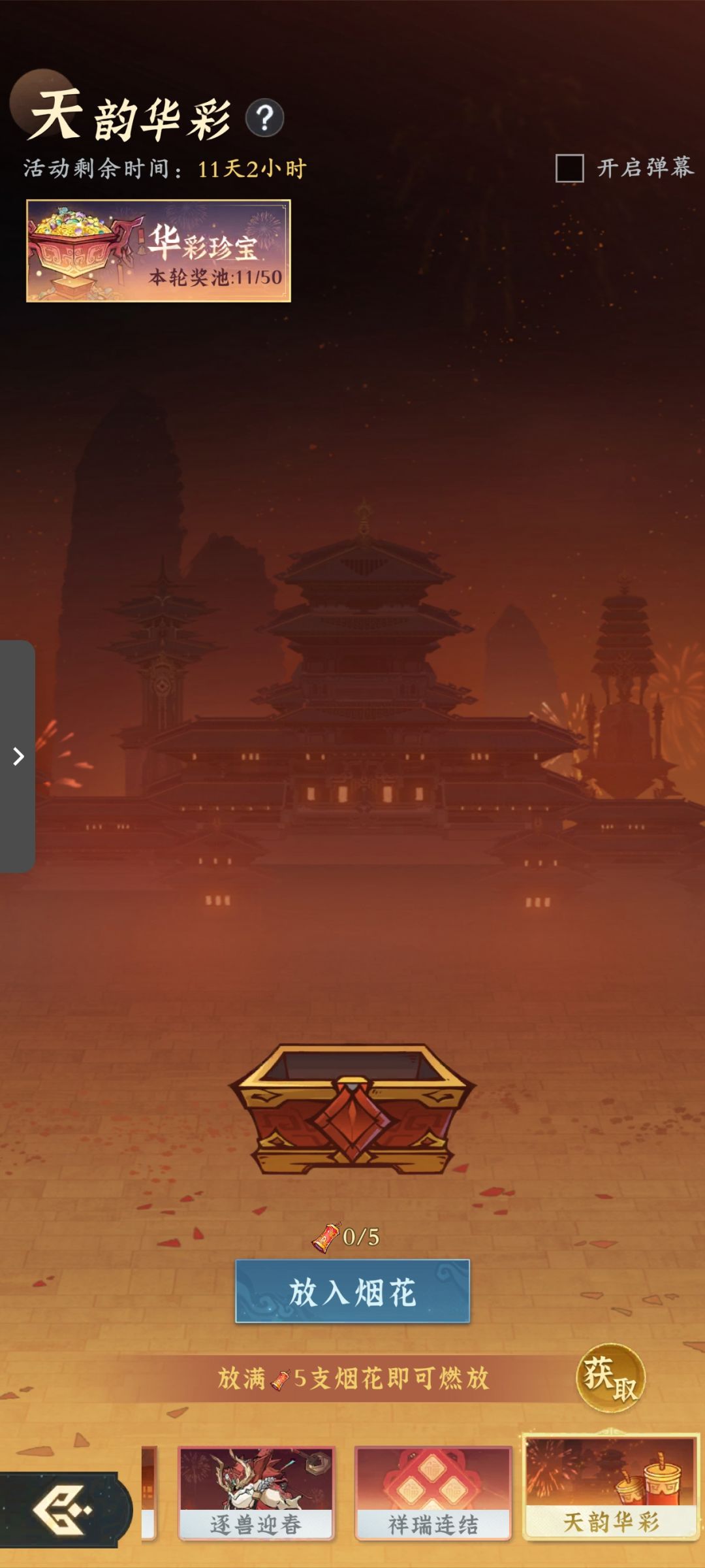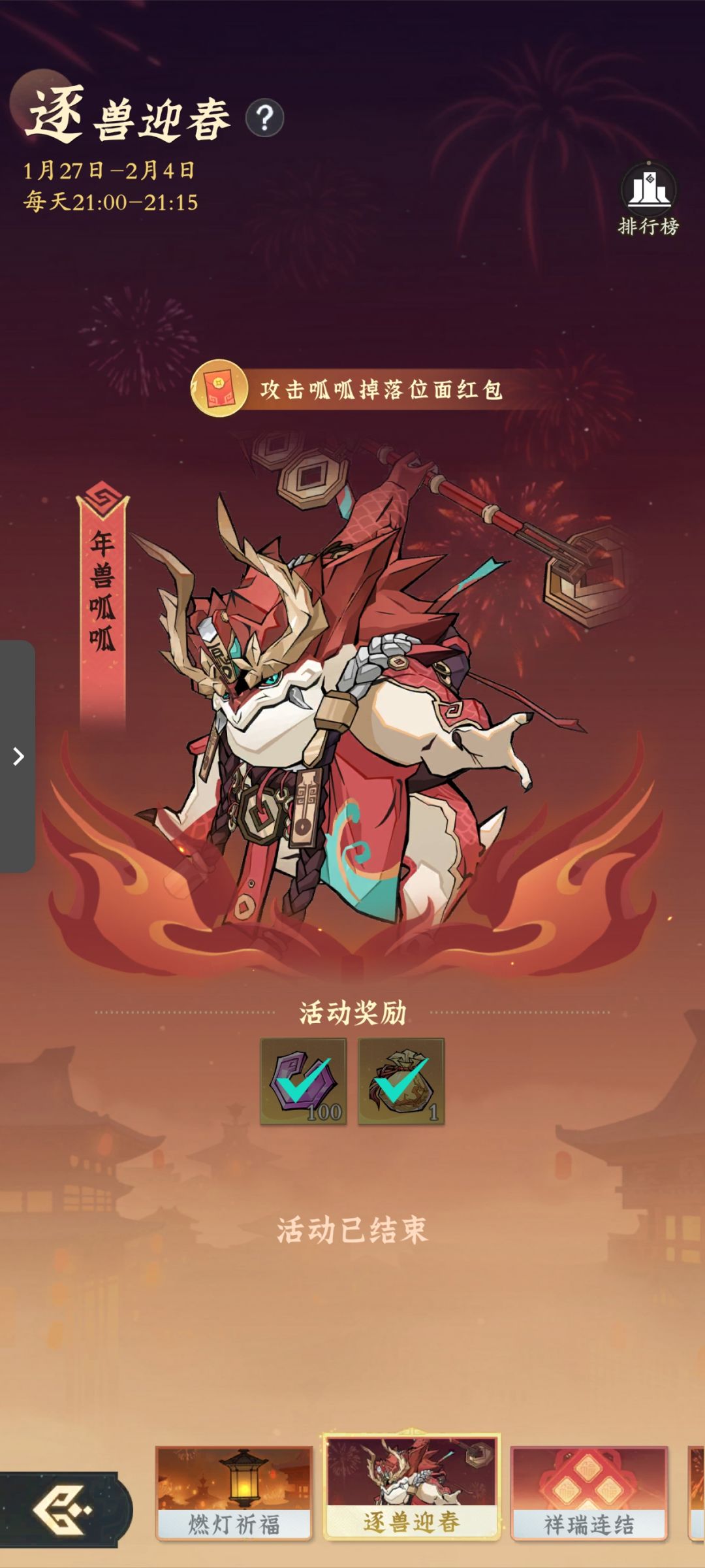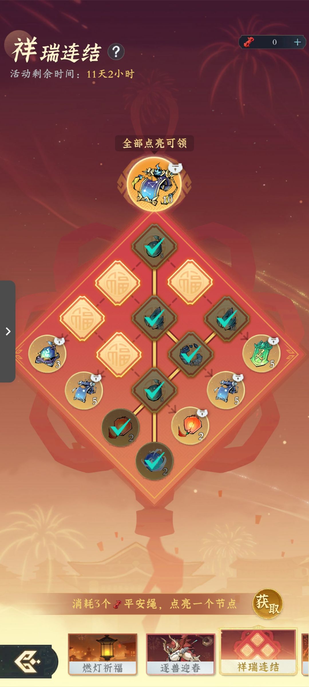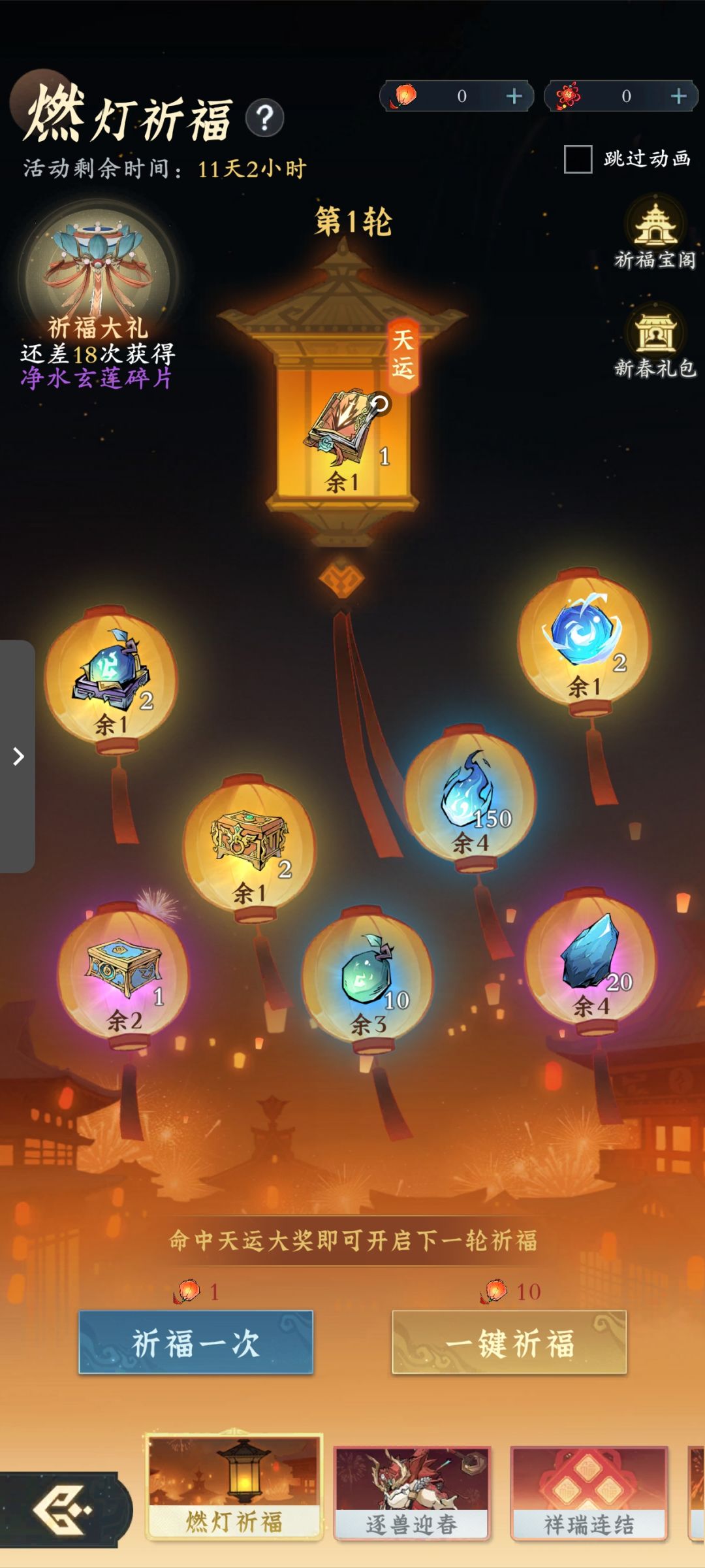新年活动1月20日已经预热,今天正式开启,一共有四个活动:燃灯祈福(抽奖活动可以获得飞行法器,特殊心法,各种材料等),逐兽迎春(打年兽领红包,奖励有仙玉,观星图等),祥瑞连结(消耗平安绳编制平安结获得奖励),天韵华彩(做日常任务获得烟花燃放获取奖励)。