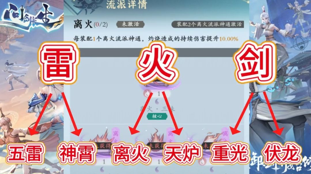 游戏中的流派选择主要有雷火剑三大体系,6个套装流派。平民玩家呢,咱就推荐火修离火派和雷修神霄派群伤推图给力,反正混伤害也可以。离火可以在竞技场爽一下,神霄派就不建议和其他玩家PK了