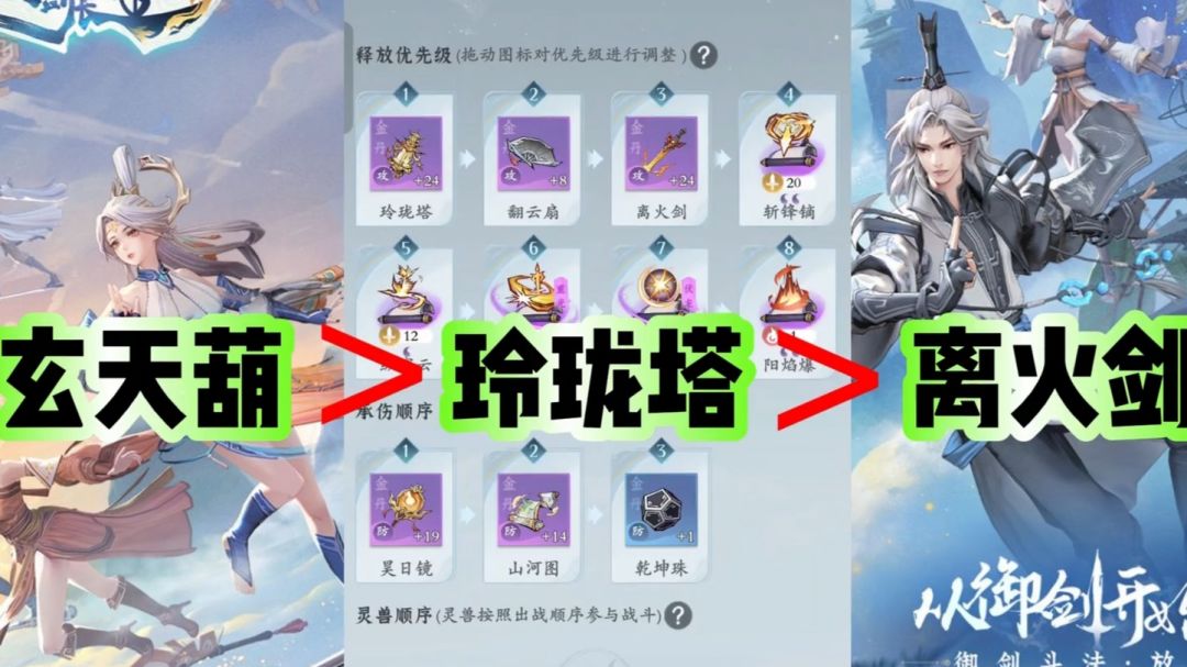 攻击位建议玲珑塔离火箭和玄天壶攻击顺序优先,玄天壶然后玲珑塔最后离火箭顺序调整,在攻塔界面的右上角点击拖动法宝就可以调整攻击顺序。防御位只有3个,直接用就可以了,没啥讲究的。至于心法,装备,终结技等等这些在元婴期前没啥好说的,有啥用啥就可以了。