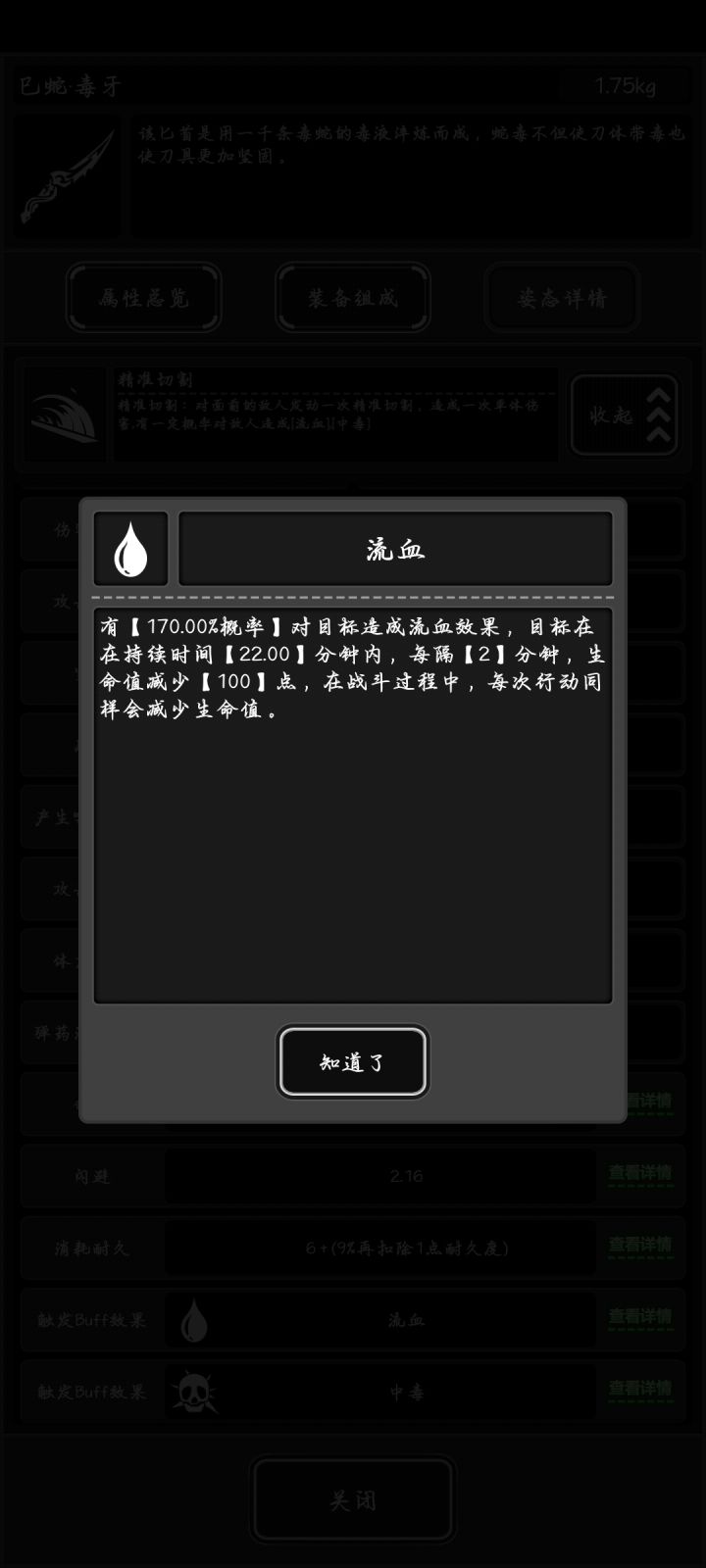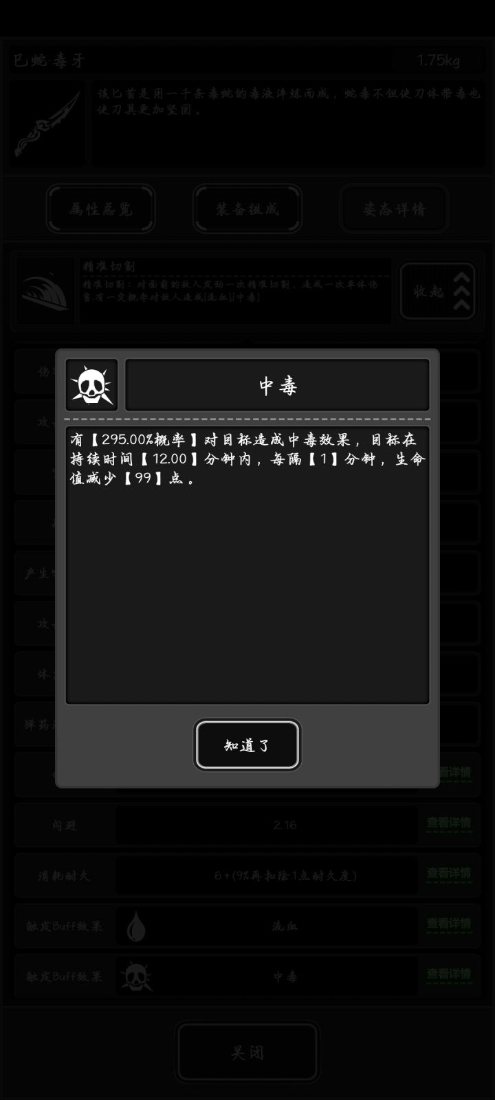 如图,如图配置的武器可以做到秒伤300,若是换到专属配件,中毒的伤害可以提升到117,由于武器自身拥有极高穿透和不低的属性面板。对于低战来说,伤害也一样恐怖。利用得当的情况下,可以无伤打8。而且几乎不消耗耐久。再加上自身附带的限定配件。几乎成为蛇包唐刀之下的性价比最优,唯一可惜的是……最近疑似有一个新bug。会导致你更换配件和零件的时候如果回档,而这次回档会把你的配件零件卡掉,目前这个导致丢失了一个再生木以及一个涂层,所以建议及时存档。