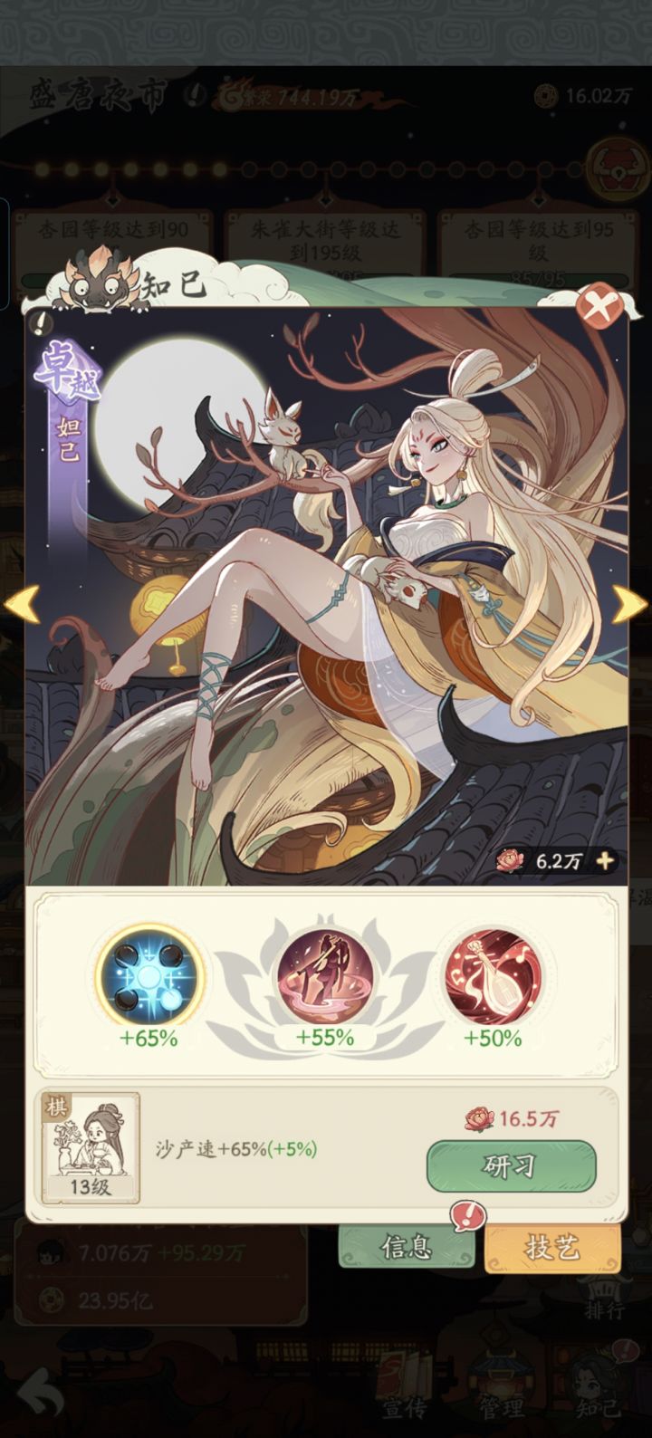 在开服的前21天,如果说到纸的时候平民还能勉强凑合,那么沙、茶平民是非常难受,没有盛唐夜市的情况下,顾问拉满沙子也就300加成,盛唐一出,沙的产量翻倍,就图里这个第一天的知己的加成能顶6个普通名士或者5个稀有名士的产值加成。
