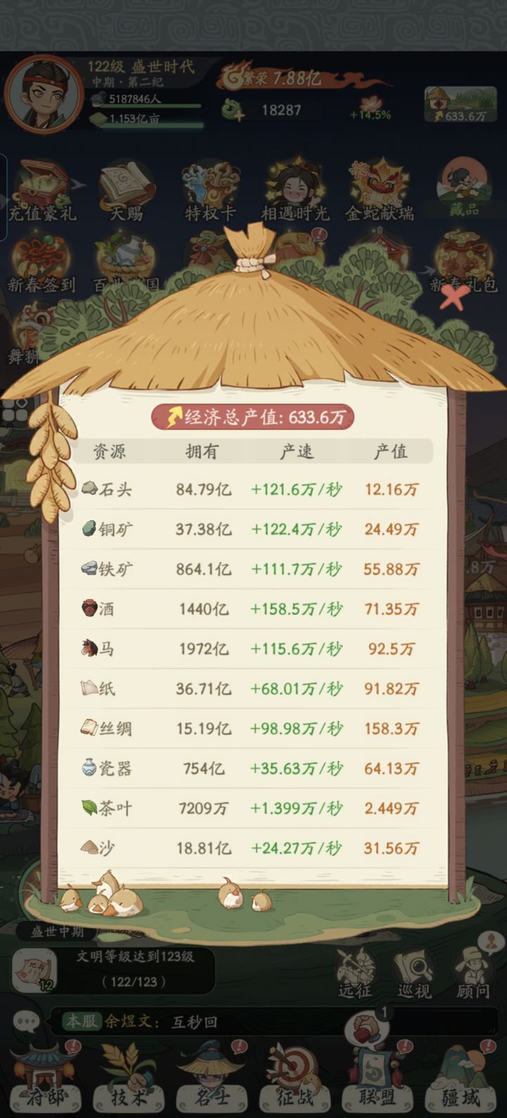 后面还有大宋没开,可以预想到大宋的副本不出意外依旧是加产值。这游戏真要喷也就看广告,一键升级也就那样,连点器就能解决,甚至精玩得慢慢升,一键升级反而亏东西,在盛唐这个副本玩法里面提现的淋漓尽致。