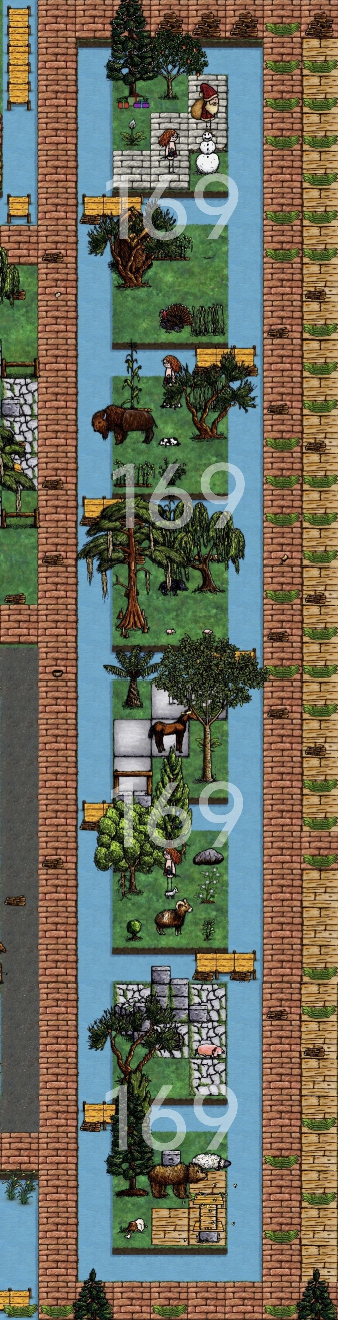 环绕我家的养殖区建立的,内含圣诞老登,火鸡,家养野牛(模拟野牛),家养野猪(模拟野猪),马,家养盘羊(模拟野生盘羊),狼,熊,蚊子,家养鹅
