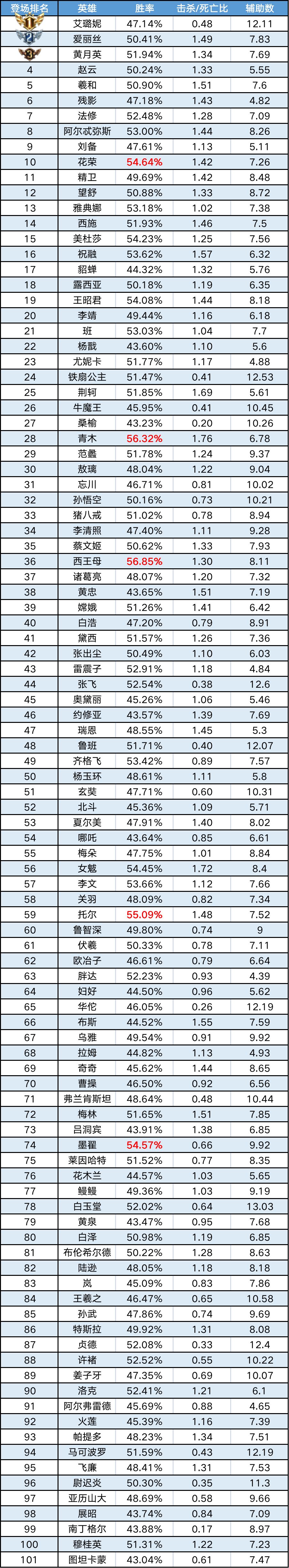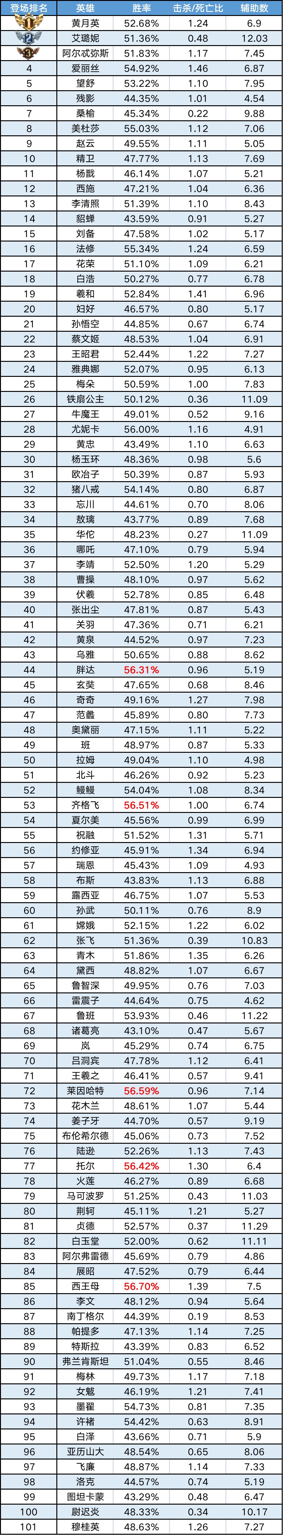 排序:按登场率高低排序,标红为胜率前5