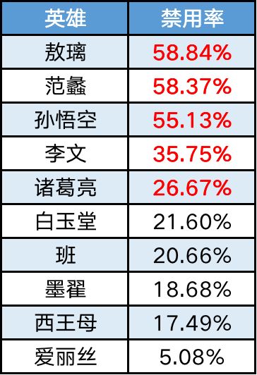 禁用率榜(敖璃范蠡暗自较劲,诸葛亮排名提升)