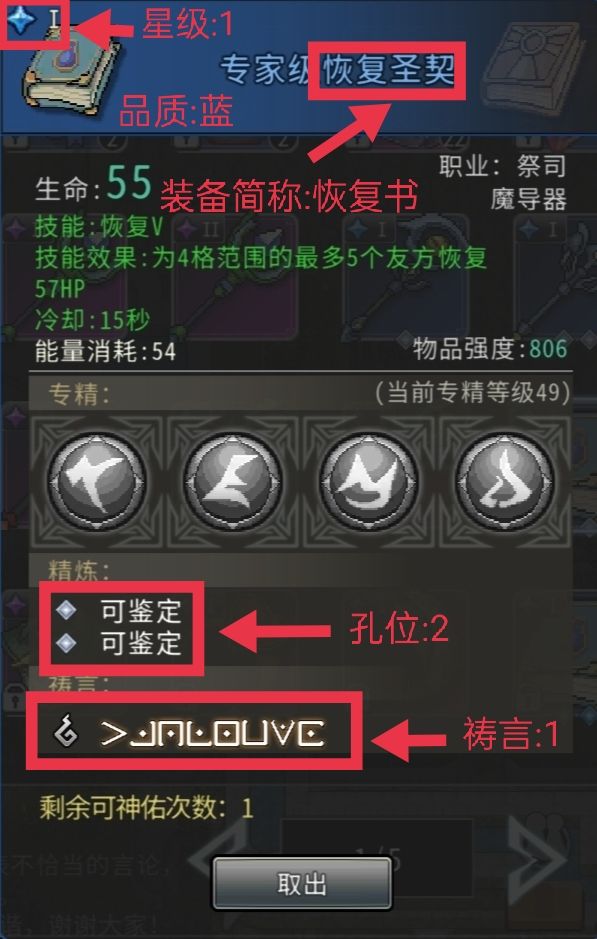 三个数字+一个颜色+一个名词 这种格式的词语。这其实是对装备的描述。三个数字分别对应的是装备的星级,装备可以精炼的孔位,以及能拥有的祷言数。颜色代表装备的品质,品质越高的装备越高。名词则通常是装备名字的缩写。举个列子: