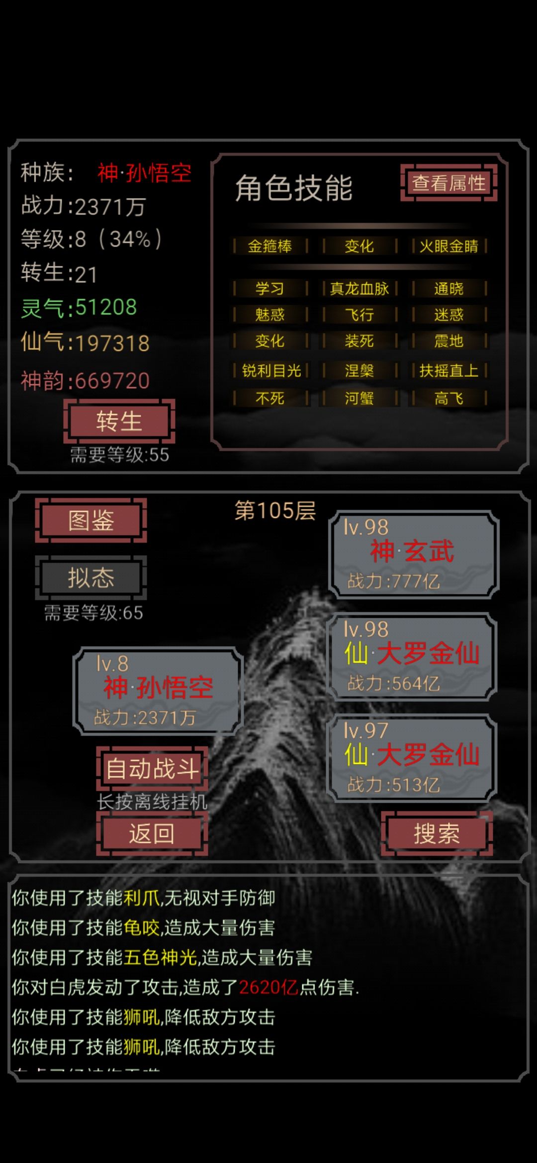 要想1级日105层,就得满足两个条件:每回合变强,不被日死。前提:技能格子不多,所以必须吞个人或者仙拿“学习”